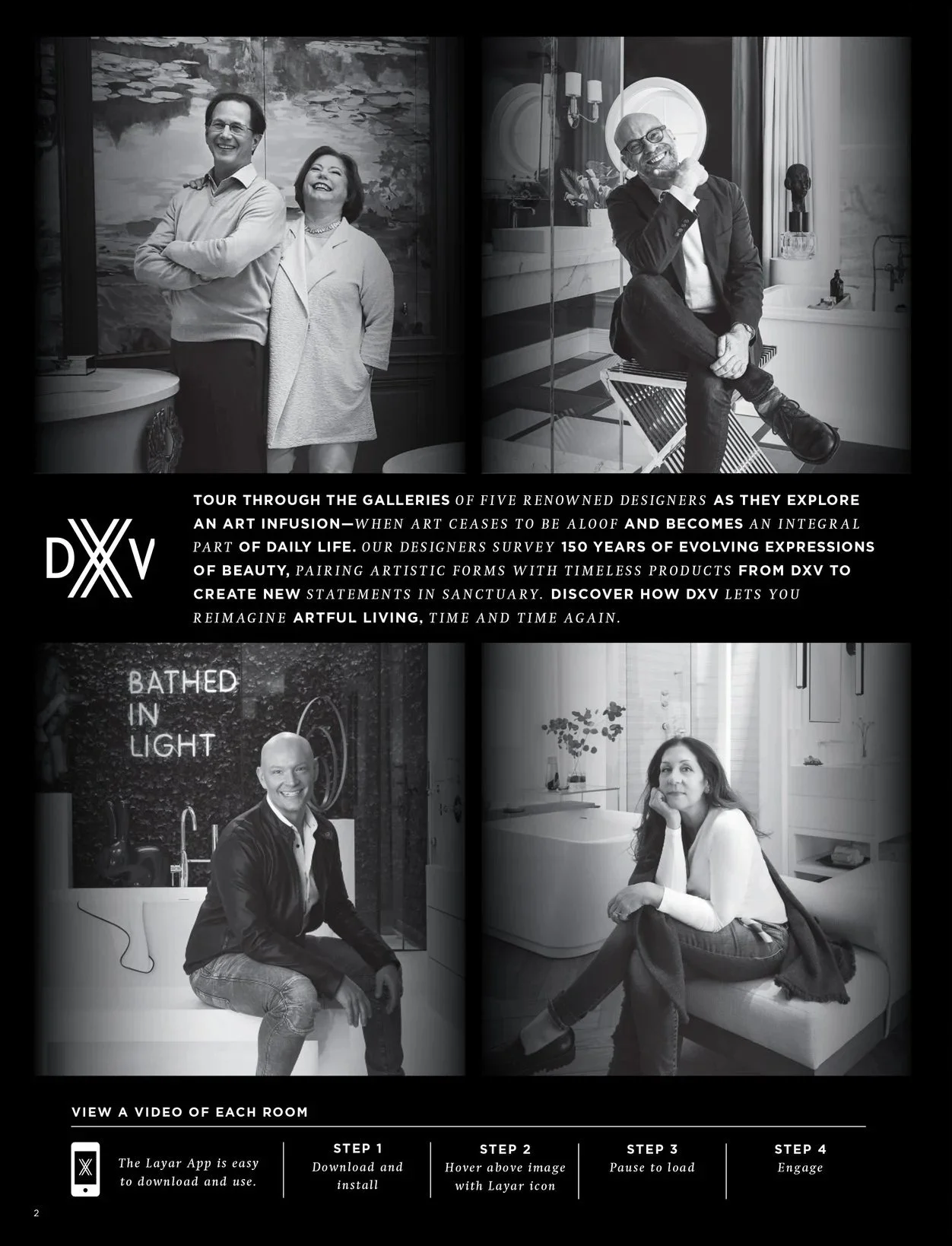 Each year, DXV invited a select set of sought-after designers to create visionary bathroom interiors featuring DXV products. Their marvels were published in a luxuriously printed magalog. It was a mutual display of product and personal inspiration, formulated into a dreamy design sequence of no-boundaries, imagine-what-if, in-your-wildest-dreams creativity.